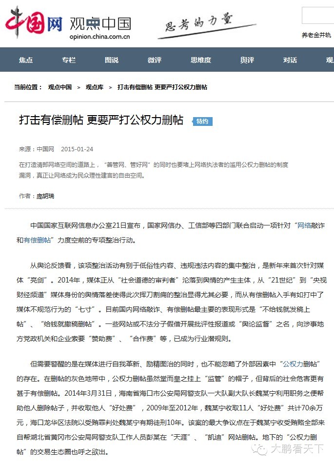 更进一步地思考。根据新华社、中国网的新闻和评论文章可以看出:以往只在传闻中才存在的“删帖指令”,看来的确是存在的。只不过,高剑云等人滥用职权,把删帖的“公权力”当作个人牟利发财的“私权力”,东窗事发了而已。