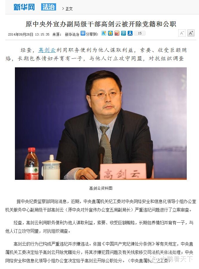 大意是说:中共中央外宣办五局原副局长高剑云这位宣传口、网络管理口的高级领导,利用手中掌握的巨大权力,大肆删帖收钱,谋取巨额利益,包养情妇生育有一私生子,并与他人订立攻守同盟,对抗组织调查……最终被查处。
