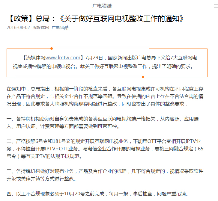 据流媒体网8月2日消息,在通知中,总局指出,根据前一阶段的检查来看,各互联网电视集成许可机构在不同程度上存在产品不符合规定,与相关企业合作不规范等问题。导致在传播的内容上存在不合法合规的情况出现,因此要求各大牌照机构就现存问题进行整改,同时也提出了具体的整改要求: