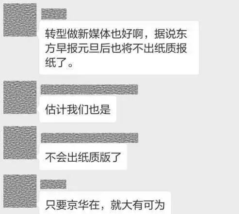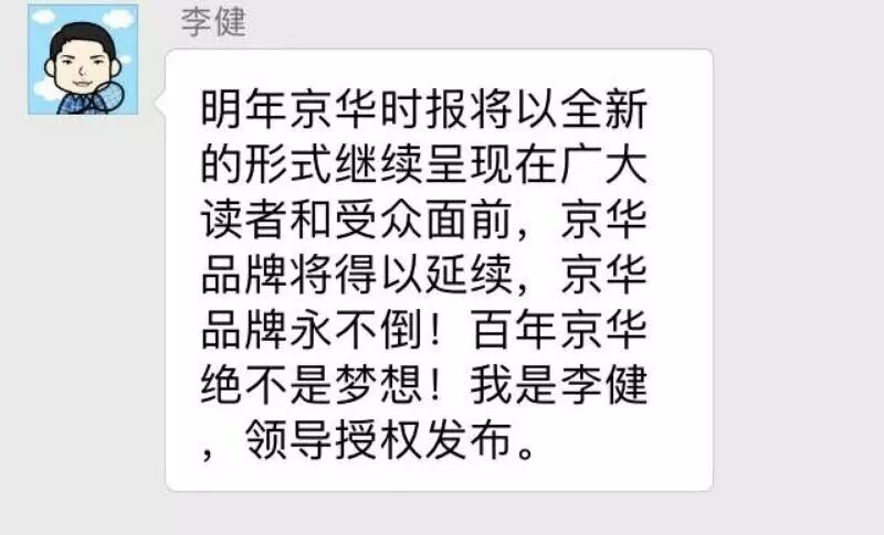 蓝媒汇今日获悉,此前对外宣布于2017年1月1日休刊的京华时报,曝出又有最新变动。 署名为李健,自称为只来73天的京华时报新员工,在微信群以 “领导授权发布”名义,称“明年京华时报将以全新的形式继续呈现在广大读者和受众面前,京华品牌将得以延续。”