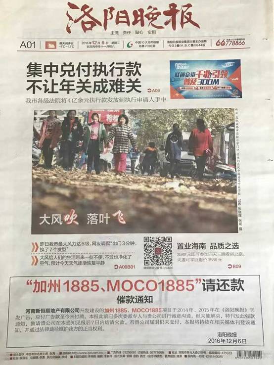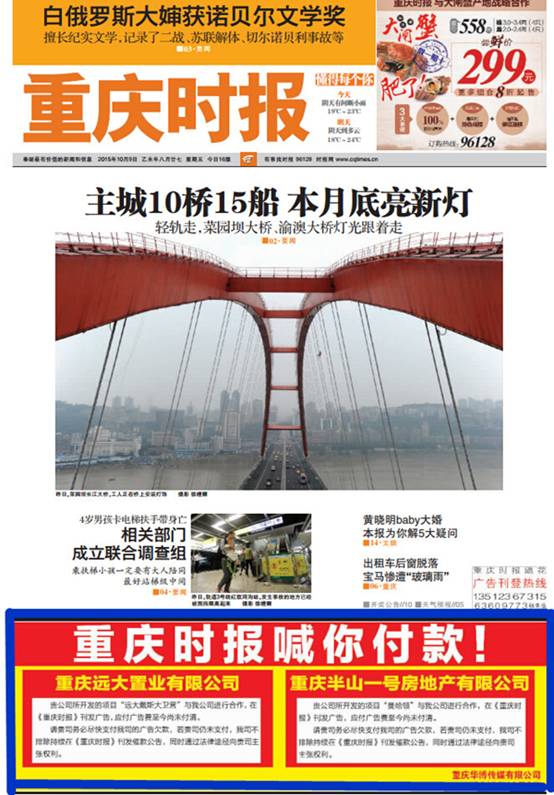 又见报纸头版催款:你丫的,还广告钱!号外,号外! 继《重庆时报》、《宁波晚报》等在头版刊发要求房企还钱的广告后,《洛阳晚报》日前也在头版与房产商直接开撕。 曾经亲密无间的都市报与房企,为何屡屡上演反目成仇的戏码? 接二连三的都市报头条催款 “以前陪我看月亮的时候,叫人家小甜甜,现在……叫人家牛夫人!”从相爱到相杀,有时候其实仅有咫尺之遥。 这在某些都市报与房企的关系身上可以得到佐证。 12月6日的《洛阳晚报》上,一则“加州1885、MOCO1885”请还款的消息,让这个千年帝都的都市报在传媒圈引发阵阵涟漪。 在这则催款通知里,《洛阳晚报》直接点出老赖房企河南新恒顺地产有限公司,在2014年和2015年的开发建设项目“加州1885、MOCO1885“刊发广告后,一直没有付清广告款。且在报社委派专人多次与其进行诚意沟通后,仍然未能解决,不得已,刊此催款通知,希望对方在7日内结清欠款。“若贵公司届时仍未支付,本报将持续在相关媒体刊登该通知,并通过法律途径维护我方的正当权利。” 这种通过登报让欠款房企上头条的方式,早已经不是第一次出现了。 今年11月21日,《宁波晚报》在报纸头版刊发题为“‘学苑名府’请还钱的催款公告”。这次针对的是房企宁波兴澳置业有限公司,公告称,对方2015年3月25日在《东南商报》发布楼盘“学苑名府”宣传广告(广告费9万元),于2015年11月10日在《宁波晚报》发布楼盘“学苑名府”宣传广告(广告费3万元),一共12万的广告费经过多次催讨未果,对方已经违约。《东南商报》和《宁波晚报》的主管主办单位都是宁波日报报业集团有限公司,与《洛阳晚报》所设期限一样,该公告希望对方在见报后7天付清,逾期将采取法律手段。 时间稍往前推,2015年10月9日,《重庆时报》也曾在头版刊发题为“重庆时报喊你付款!”的催款公告。两家房企——重庆远大置业有限公司和重庆半山一号房地产有限公司被点名,要求其尽快付清欠款。 接二连三的都市报与房企因为广告欠款上演的撕逼大战,某种程度上,也是都市报在移动互联时代无奈境况的写照。 都市报传统广告被分流 随着移动互联时代的来临,都市报广告下滑的趋势,已经越来越明显。 根据中国广告协会今年2月份发布的《中国报纸广告市场2015年度报告》显示,2015年报纸广告降幅在传统媒体中最大达35.4%,资源量(广告占版面积)降幅达到37.9%。在报纸广告下降的行业中,房地产降幅更是高达44.8%,属报纸广告降幅最大的行业。 这在十多年前,肯定无法想象。那时候的都市报广告版面,一位难求是常事。为了抢占报纸版面,一些广告主,包括房地企业,还会出现竞价上版的情况。汽车、卖场及房产广告是都市报的传统优势,也是都市报广告的核心。 但随着新媒体的异军突起,新媒体传播的渠道优势和精准性,已经越来越受到投资者、广告主、营销机构的认可。 伴随新媒体冲击而来的,是传统报业的读者普遍流失,盈利降低、广告下滑等事关都市报“生死攸关”的问题。 《21世纪经济报道》的创始人刘洲伟曾经在该报十周年的献词中写到:“如果不出意外,报纸这样的东西断送在我们这一代报人手上,已不是什么悬念。我们还年轻,报纸却老了,挽歌隐隐传来,正是仓皇辞庙日。耶稣失去教堂,世界将会怎样?也许没有比这更糟糕的事情了……但如果失去的只是锁链,你有可能进入一个新的美丽世界,新闻不死,报人涅磐……” 从周报,到日报、都市报,作为最有公信力的媒体质疑,报纸一直为人民群众所认可,但随着新闻传播方式的改变,它与人们生活的联系,开始渐行渐远。 作为都市报一直以来的广告大客户,房企在新的形势面前,也不得不考虑广告投放的渠道。 与新媒体比,纸媒生产成本高,又受限于传播载体,其与读者的互动性及时效性相对较弱,纸媒没落的另一重要原因,是其内容的同质化。