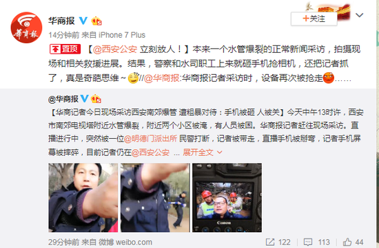![]() [西安公安 立刻放人!]本来一个水管爆裂的正常新闻采访,拍摄现场和相关救援进展。结果,警察和水司职工上来就砸手机抢相机,还把记者抓了,真是奇葩思维~华商报:华商报记者采访时,设备再次被抢走。 据先前报道,今天中午13时许,西安市南郊电视塔附近水管爆裂,附近两个小区被淹,有人员被困。华商报记者赶往现场采访。直播进行中,突然被一位明德门派出所民警打断,记者被带走,直播手机被掰弯,记者手机屏幕被摔碎,目前记者仍在西安公安明德门派出所滞留室内。另一路记者的相机也被西安市自来水公司工作人员抢走。目前,更换设备后,现场直播已再次进行,网友可继续关注该事件的发展情况。希望事件得到妥善解决。 编辑:何林 |