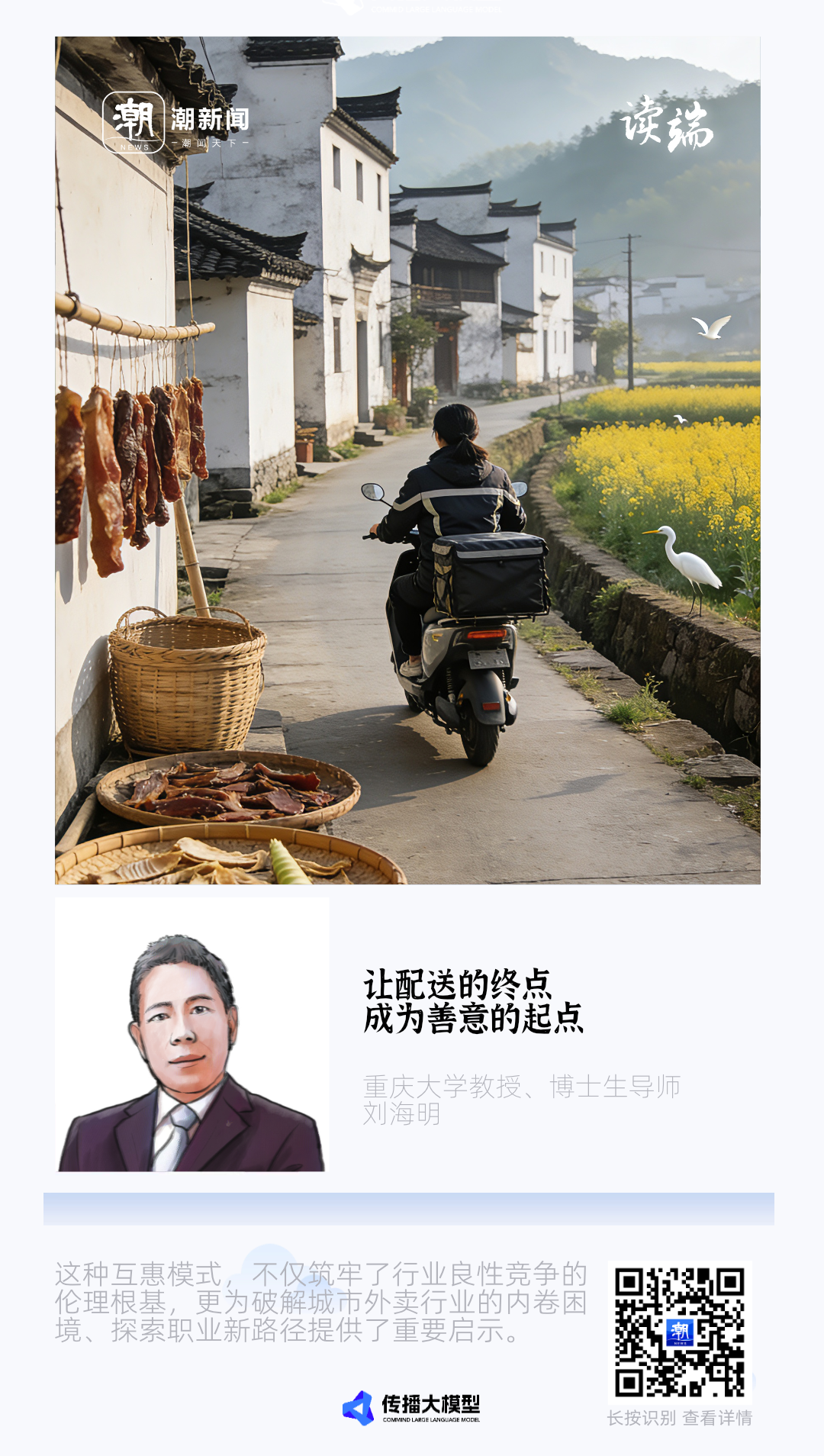 见刊稿: 读端丨把日子骑成了松弛的模样 刘海明:让配送的终点,成为善意的起点 ![]() 无抢单内卷、时间自由、月入过万……小镇骑手的日常,你羡慕了吗? 近日,江苏省徐州市马陵山镇“唯一外卖员”张瑜的跑单日常火上了热搜,也让这群穿梭于中国广袤乡镇的“小镇骑手”走进公众视野。他们像风一样自由,又像及时雨一样贴心,既送热乎的饭菜,也包揽跑腿、代购、送药等多元服务,“十八般武艺”样样精通;他们将便捷的生活送进乡间村落,填补乡镇物流的“最后一公里”。 ![]() 2020年,外卖骑手登上《时代周刊》封面,让这一中国城市里的庞大新兴职业群体走进全球视野,他们身上的集体荣光与非凡使命感,正是打动世界的核心。 当外卖骑手成为城市街头的日常风景,行业也陷入了内卷式竞争的困境,业界与学界都在寻求破局之路。而杭州的小镇骑手们,却以朴素的道德责任感,走出了一条全新的职业路径:依托乡镇熟人社会的特质,把物流配送的“最后一公里”,变成了充满人情味的服务闭环,为互惠伦理找到了鲜活的落地场景。 道德从来不是孤立的。以善意待人,对方感受到温暖后,也会以善意回应。这份始于功利场景的互惠,最终生长出超越功利的新型人际关系,而创新道德实践的人,终将收获时间的馈赠。 杭州小镇骑手的实践,正是对互惠伦理的绝佳创新。在世俗视角里,外卖配送只是一单纯粹的商业服务:下单、配送、履约完成,关系即终止。这种模式追求效率与规模,骑手赚取即时酬劳,本无可厚非,却未必是外卖服务的最优解。 这种纯效率模式在都市陌生人社会广为流行,但商业服务是否需要道德的温度?升温之后又会带来怎样的改变?杭州的小镇骑手给出了答案:他们在配送之外,把人文关怀与助人为乐纳入服务范畴,从单纯的送货人,变成了传递善意的纽带。“惠人”的额外付出,为他们赢得了用户的信任,最终实现了间接的“惠己”,这份互惠伦理,正是他们独特服务模式的核心。 如今,全国乡镇新增外卖骑手岗位已达12.7万个,越来越多从业者将配送服务与暖心关怀深度融合。这种互惠模式,不仅筑牢了行业良性竞争的伦理根基,更为破解城市外卖行业的内卷困境、探索职业发展新路径提供了重要启示。我们也期待,这份互惠伦理,能为外卖行业开辟出全新的发展格局。 ![]() 原作: 不抢不卷,互惠伦理成就了小镇骑手新模式 刘海明 2020年,外卖骑手登上《时代周刊》封面,让全世界关注到中国城市庞大的这个新兴职业群体。外卖骑手的这份集体荣光,是“非凡的使命感”,也是他们名扬海外的道德密码。 当外卖骑手成为当代中国城市街头的一道风景线的时候,也带来了内卷式竞争的问题。外卖骑手职业要发展,需要探索超越内卷式竞争的模式。当业界和学界在寻求突破这一瓶颈的同时,杭州那些名不见经传的小镇骑手,用他们的道德责任感,探索出一条外卖骑手的新模式,把乡镇物流的“最后一公里”,变成了人情味的“最后一公里”。通过“熟人社会”的温情服务,为互惠伦理资助小镇骑手的日常工作中找到了崭新的应用场景。 道德从不孤立。当一个人用道德的方式对待他人,在道德情感的相互传达中,传达者表达的是纯真的善意,被传达者感受到的是道德情感的温暖,进而愿意用道德的方式对待他人。这样的互惠从功利的角度出发,最终演绎出超越功利的新型人际关系。好不夸张地说,谁在道德实践中创造了新的道德方式,道德基础必然给他带来延时的酬赏。 在互惠伦理创新实践方面。杭州的小镇骑手的探索值得赞许。 用世俗的眼光审视,外卖骑手是一种纯粹的商业服务,我下单,你服务,货到合约结束,也就互不相关。这样的商业服务模式,追求的是速度和量的增长,外卖骑手收获的是即时的酬赏,通过辛勤付出把钱赚到手就行。这样的服务关系无可指摘,至于是否理想的外卖服务模式,另当别论。 在都市的陌生人社会,这样的商业模式可以流行,但商业服务要不要道德的加温,如果加温了,带来的连锁反应是什么,显然是个饶有兴趣的话题。小镇骑手在送外卖的同时,把人文关怀和助人为乐变成了义务。这样,外卖骑手不再是单纯的送货员,同时变成了道德使者,惠人成为他们的额外工作。惠人,让他们获得了客户的信任,从惠人过程中,也在间接惠己,这样的互惠伦理,成就了小镇骑手的服务模式。 现在,全国乡镇新增外卖骑手岗位已达12.7万个,这个庞大的职业群体把送外卖和贴心服务融合起来,互惠在奠定了不抢不倦伦理根基的同时,也为城市外卖骑手探索新模式有所启示,期待互惠伦理成就未来外卖骑手的新模式。 原文链接:https://baijiahao.baidu.com/s?id=1859318035727341533&wfr=spider&for=pc 编辑:马丽萍 |