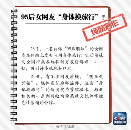 除了误传误信,更难以防范的是出于各种动机、利益的主动造假,其中尤为恶劣的是运用新闻操作手法的造假。比如围绕热点事件做热策划,2012年王石离婚事件后某网络炮制假“离婚协议书”;再比如诉诸低级趣味吸引眼球,今年10月,某视频交友APP炮制网帖《用身体换旅行:95后萌妹向全国征集各地临时男友陪游》。