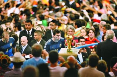 这幅中国摄影师鲍泰良于2014年7月14日在巴西里约热内卢马拉卡纳体育场拍摄的阿根廷球员梅西凝视“大力神杯”的照片获得第58届“荷赛”体育类单幅一等奖。据新华社