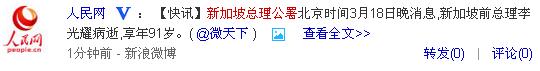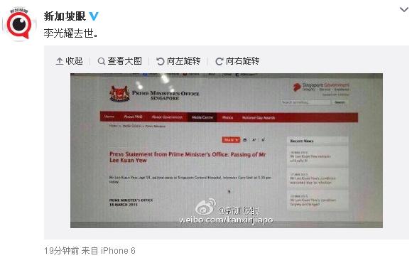 媒体误报截图 今天晚间,网上流传一个冒充新加坡总理公署网站文告的截图,称新加坡总理李光耀已经逝世。新加坡亚洲新闻台及联合早报向总理公署查证,它未发布任何新信息,总理公署呼吁公众查证消息来源的链接。与此同时,总理公署已经就这起假文告事件报警。