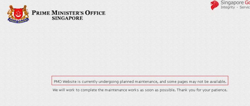 这是事发时小编到新加坡总理公署查证时的页面,网站维护中,并未发布“李光耀病逝”的消息。 |