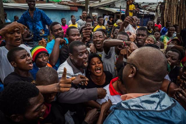 2014年8月25日,蒙罗维亚西点贫民窟的居民在被隔离后向一名政府官员抱怨缺乏生活必需品。 摄影:Daniel Berehulak