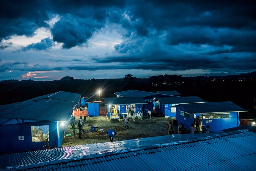 2014年10月6日傍晚,利比里亚邦县(Bong County),医疗卫生工作人员在埃博拉治疗部忙碌。 摄影:Daniel Berehulak