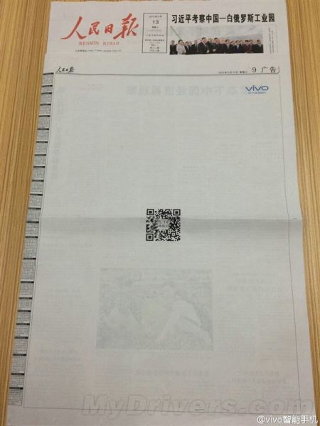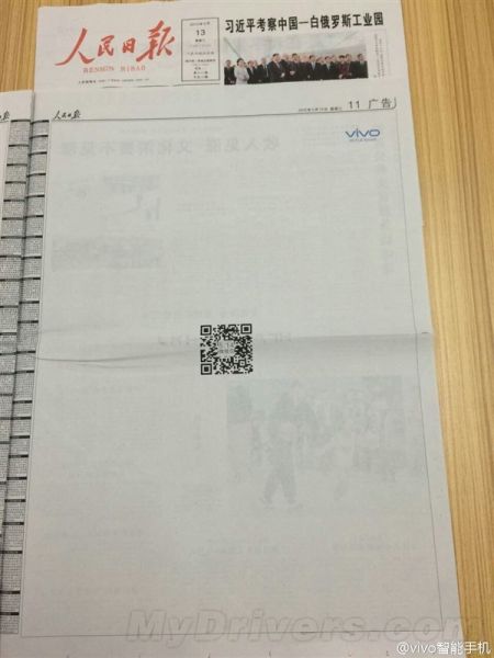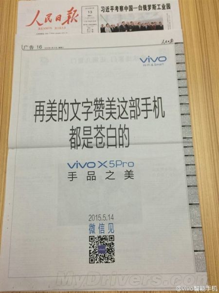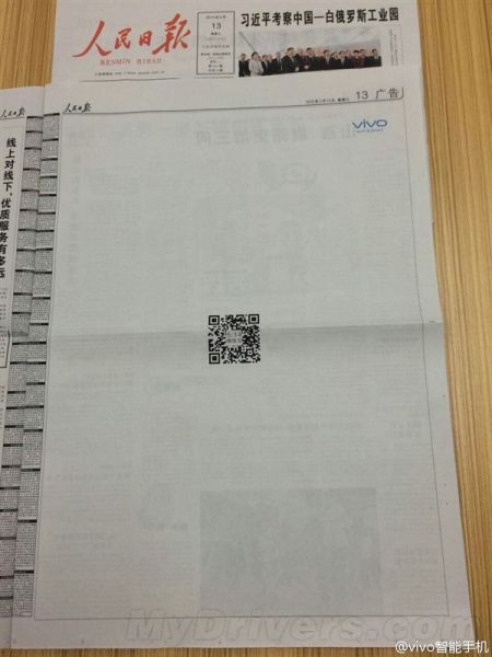 报纸上打个广告再正常不过了,可你见过下面这么拼的吗? 今日,人民日报首次连开四版广告,除了第一版的简单几句介绍外,其余三版仅一个二维码,简直碉堡了。 话说,vivo为了新机X5Pro的宣传,也真是蛮拼的。 据了解,vivo将于5月13日20:00在广州乐无止境”X5Pro手品会,届时X5Pro将正式发布。 vivo X5Pro号称国产最美手机,采用了双面2.5D玻璃,金属中框,手机正面没有实体按键。 下方的vivo Logo是一大亮点(应该是Home键),还会发光。 此外,该机还搭载了新科技“Eye ID眼球识别技术”用于加密APP,采用了最新的USB Type-C接口,前置摄像头支持合成3200万超清像素,后置摄像头支持相位对焦(比iPhone 6更快),搭载骁龙615处理器,运行Android 5.0系统,电池容量3500mAh。 ![]() ![]() ![]() ![]() |